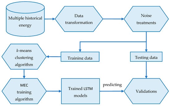 The computation of the MEC training algorithm is summarized as follows. The input of this algorithm is n clusters, which are processed in the previous step. For each cluster in the training dataset, the algorithm will train an LSTM model using the center point time series, which is denoted as LSTM_Modelbase (Lines 2–4). Then, the algorithm uses LSTM_Modelbase as a base model for training the remaining profiles by using transfer learning to reduce the computation time (Line 5). Finally, the algorithm returns the LSTM models of all profiles (Line 6). Due to the advantages of transfer learning, our proposed framework reduces the overall computation time. Hence, our method reasonably outperforms traditional machine learnings w.r.t. computational time.