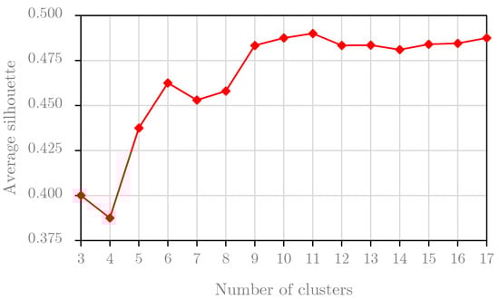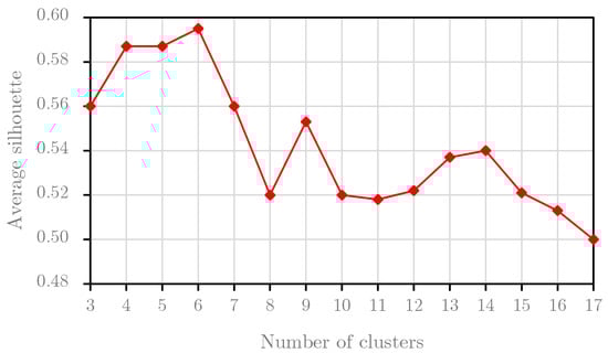 This section performs the Silhouette analysis for two experimental datasets. Silhouette analysis serves to find the separation distances between resulting clusters. The result of this analysis, the Silhouette plot, shows a measure of the closeness between each sample in one cluster and samples in the neighboring clusters. Based on this plot, we can identify the best number of clusters. We perform the Silhouette analysis for the first two years of the B1 dataset, i.e., the training the B1 dataset, and we obtain the graph result in Figure 7. Based on the results, we choose the optimal number of clusters for the B1 dataset at 11 because the average Silhouette score reached the highest value with the cluster number of 11. For the B2 dataset, the result of the Silhouette analysis for the training set of the B2 dataset is presented in Figure 8. Obviously, we set the optimal number of clusters for the B2 dataset to 6 because the graph in Figure 8 peaks at this value.
