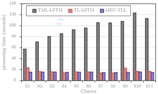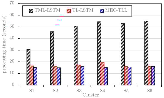 This study first plots the average learning and predicting times of TML-LSTM, TL-LSTM, and MEC-TLL approaches for each cluster on the B1 dataset (see Figure 9) and B2 dataset (see Figure 10). Note that these graphs only consider the training and predicting time for each cluster in the B1 dataset and B2 dataset. In general, the results in both figures are consistent, where TL-LSTM and MEC-TLL obviously outperform TML-LSTM. In particular, Figure 9 shows that the average computational times of TML-LSTM range from 57 s to 123 s, whereas the average computational times of TL-LSTM and MEC-TLL range from 15 s to 23 s. Therefore, the transfer learning-based approaches improve at least 75% of the computational time compared to the traditional machine learning approach on the B1 dataset. In Figure 10, the average computational times of TML-LSTM range from 30 s to 54 s, whereas the average computational times of TL-LSTM and MEC-TLL range from 15 s to 19 s. Therefore, the transfer learning-based approaches improve at least 50% of the computational time compared to the traditional machine learning approach on the B2 dataset.