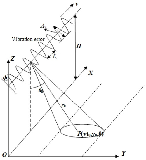 Considering that the influence of high-frequency vibration error perpendicular to the line of sight on the imaging quality of THz-SAR can be ignored [19], only high-frequency vibration error in the plane along the line of sight is considered here, as shown in Figure 1. The high-frequency vibration error is in the YOZ plane, and the angle between the vibration direction and the axis is . The period of vibration is . The radar platform flies horizontally along the direction with a speed . The height of the radar platform is . The coordinates of the radar platform at the azimuth moment can be expressed as . For arbitrary point target in the imaging region, whose zero doppler time is , the instantaneous slant range can be expressed as