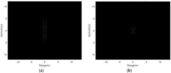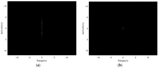 Then, the multi-point targets are used for the simulation experiment. The THz-SAR imaging results of the RD algorithm and the new proposed imaging algorithm in this paper are showed in Figure 8a,b, respectively. It can be seen from Figure 8 that the new proposed imaging algorithm in this paper is still applicable to the case of multiple point targets and can effectively suppress paired echoes.
