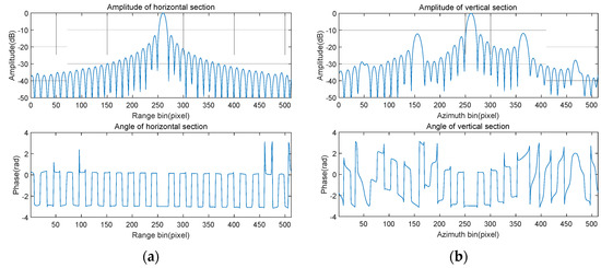 In order to test the focus quality of the point target more intuitively, a rectangular window is adopted to intercept the point target in Figure 6b. After up-sampling eight times, the resulting two-dimensional sections (amplitude and phase) are shown in Figure 7, respectively. As can be seen from the two profiles, the range resolution and the azimuth resolution are 0.0664 and 0.0696 m, the peak sidelobe ratios are −13.2643 and −11.8592 dB, and the integral sidelobe ratios are −30.2416 dB and −25.6668 dB, respectively. The theoretical range resolution and azimuth resolution are known to be 0.0664 and 0.0692 m, respectively. Hence, the point target is well focused. Since the estimation of high-frequency vibration error is not ideal, the residual error after compensation makes the azimuth peak sidelobe ratio slightly higher. Therefore, it is necessary to further improve the estimation accuracy of the high-frequency vibration error or adopt the window function for suppressing the sidelobe.