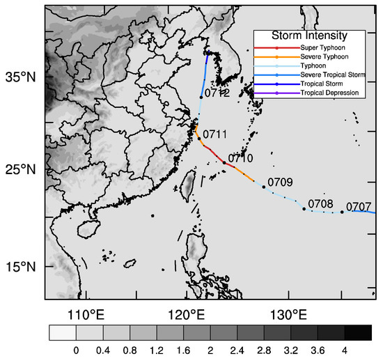 Chan-Hom was formed near the east ocean of the Philippines on 30 June 2015 with a maximum wind of 18 m/s and a minimum pressure of 995 hPa in its core. Then, it was upgraded to a severe tropical storm on 2 July 2015 and a Typhoon on 3 July 2015 by the Japan Meteorological Agency (JMA). Forced by the subtropical anticyclone, it moved northwest and was strengthened gradually. It approached the coast of Fujian and Zhejiang Province in China on 10 July 2015 and landed in Zhejiang Province on the following day. During this process, it went through a rapid intensification to a super typhoon. Afterwards, it reentered the sea, moving northwest by north, and was weakened continuously due to friction and the blocking of sufficient heat and moisture from the tropics. On the night of 12 July it landed again at the Korean Peninsula. After landing, its strength continued to be weakened and its number was stopped. Its track, observed by the China Meteorological Administration (CMA) [38], is partially shown in Figure 1. Because of its long lifespan and high strength, the economic losses were up to RMB 9.8 billion and heavy casualties occurred.
