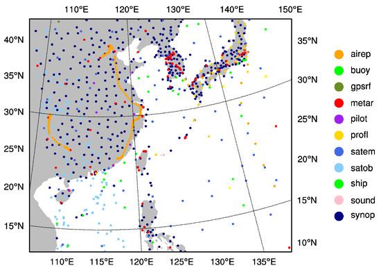 - Considering the complex underlying surface of the terrain, only the observations over sea are assimilated, and the observations on the land and the observations with comparatively complex types of sea surface are excluded. Those complex types refer to the mixed predominately sea, mixed predominately sea ice, mixed predominately land, or mixed predominately snow marked by the WRF forecast model.