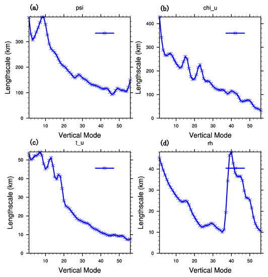 Horizontal length scale of control variables (a) ψ, (b) χ, (c) nonequilibrium temperature, and (d) relative humidity.