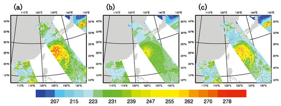 The brightness temperature (unit: K) of channel 6 of (a) the observation, (b) the background simulation, and (c) the analyzed field after data assimilation (DA) at 1800 UTC on 9 July 2015.