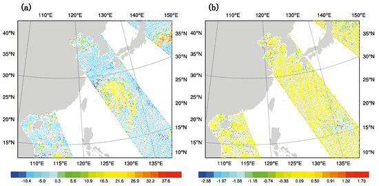 (a) OMB (unit: K), and (b) OMA (unit: K) of channel 6 after bias correction at 1800 UTC on 9 July 2015.