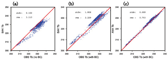 The scatter diagram of the observed brightness temperature (unit: K) and the simulated brightness temperature (unit: K) (a) before DA without bias correction, (b) before DA with bias correction, and (c) after DA with bias correction.