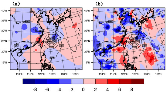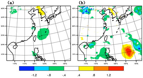 The temperature increment of GTS_DA and GMI_DA are shown in Figure 7 at 1800 UTC on 9 July 2015 when the location of the typhoon is 25.1° N, 126.6° E. In GTS_DA, near the core of the typhoon, there is a negative temperature increment, which is inconducive to the maintenance of the typhoon. However, in GMI_DA, the sphere of the negative increment is greatly reduced, resulting in a relatively positive increment. Probably due to the theory of charge-induced effects in water droplets, anomalies at microwave frequencies are able to contribute to the model thermal fields [30]. This positive increment is favorable to the warm core structure of the typhoon and the sustainment of typhoon intensity thermodynamically.