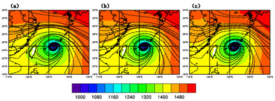 Figure 9 shows the geopotential height and streamline fields at 850 hPa of CTNL, GTS_DA, and GMI_DA, respectively, at 1800 UTC on 9 July 2015. On the east of the typhoon core, the thickness of streamlines of GTS_DA and GMI_DA is more intensive than CTNL, and the typhoon core of GMI_DA with overlapped lines extends more to the east than in the other two experiments, denoting that the typhoon is intensified after GMI DA.