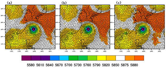 Figure 10 shows the wind field and geopotential height at 500 hPa of CTNL, GTS_DA, and GMI_DA, respectively, at 1800 UTC on 9 July 2015. For CTNL, the wind speed near the outer side, especially the northeast side, of the typhoon core is weaker than that of GTS_DA, and that of GMI_DA has the strongest wind field. Meanwhile, near the 588 dagpm in the northeast position of the typhoon, the southeast wind component of GMI_DA is larger than that in the CTNL and GTS_DA. It denotes that GMI_DA is able to strengthen typhoon intensity. The relatively larger southeast flow is conductive to driving the typhoon towards the northwest.