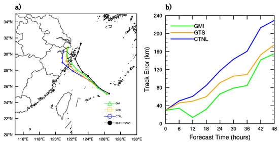 - In the 48-h deterministic forecast, the track error of the typhoon predicted by the GMI_DA experiment is the smallest, with a maximum value below 160 km, when compared with GTS_DA and CTNL.