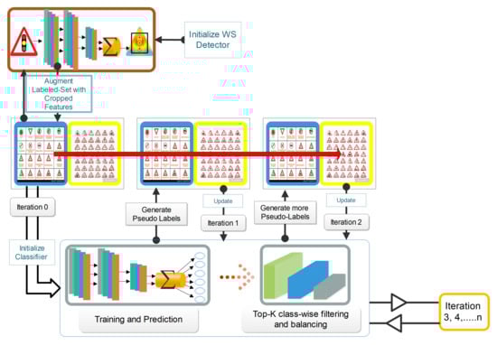 To this end, there is the assumption that less traffic signs that have been well labeled are available together with a chunk of unlabeled ones. Several works [3,4,5,6,7,8] have been done in the past to address the traffic sign recognition task. However, the availability of unlabeled datasets has been less considered and less exploited in terms of traffic sign recognition tasks. With the little literature existing on the topic of Traffic Sign Recognition (TSR) [2,4,6,7,8], it is generally difficult to decide which Convolutional Neural Network (CNN)-based method gives the best result due to the performances that have been reported on benchmark datasets. Some studies [9,10,11] have evaluated their methods on self-gathered private datasets, whereas in other studies [12], the benchmark datasets were combined with self-collated traffic signs, to enrich the dataset for detection and recognition tasks. However, one common thing that is observed among these methods is that they focus on using classical supervised learning to either detect or classify only well-annotated data samples, which results in underperformance when implemented in a real-world scenario. Some of these methods were implemented via traditional hand-crafted features, such as the histogram of oriented gradients (HOG) [11,13,14,15], local binary patterns (LBP) [11], and integral channel features or scale-invariant feature transform (SIFT) [11,16], together with a wide range of machine learning and statistical learning algorithms [9,11,12,14,15,16,17]. Just like in the computer vision world, CNN-based models have been implemented and evaluated in traffic sign recognition tasks. Deep CNNs have achieved huge success in computer vision tasks, cutting across object detection [18,19,20], clustering and association [21], classification [22,23,24], and segmentation [18,25,26]. CNNs have been deployed in many studies [6,7,11,27,28] to learn representations and classifiers automatically. Domen et al. [28] proposed a deep learning framework with end-to-end full feature learning. Their approach was based on Mask R-CNN, which used a region proposal network to employ deeper network architectures in detecting and classifying traffic signs. In the study [29] conducted by Alvaro et al., a single CNN for automatic recognition of traffic signs that alternated convolutional and spatial transformer modules was utilized. Extensive experiments were conducted on the German Traffic-Sign Recognition Benchmark (GTSRB) and the Belgium Traffic Sign for Classification (BTSC) dataset to find the best CNN architecture, as well as to investigate the impact of multiple spatial transform network configurations within the CNN, together with the effectiveness of four stochastic gradient decent optimization algorithms. A recognition accuracy of 99.71% was obtained for precision, recall, and F1-score for the GTSRB and the BTSC; 98.95%, 98.87%, and 98.86% were obtained for the precision, recall, and F1-score, respectively. The recognition rate was improved by the study conducted by Mahmoud et al. [30]. Mahmoud et al. combined features learned by deep convolutional generative adversarial networks (DCGAN) and pseudoinverse learning autoencoder (PILAE) supplemented with the softmax classifier method to obtain excellent performance with a recognition rate of 99.80% on the GTSRB and 99.72% on the BTSC, as compared to handcrafted features and other methods that were DNN based. DCGAN was utilized to extract the informative features in an unsupervised way without needing an expert analysis of the learning process and PILAE to train the model faster. Furthermore, Sermanet et al. applied the convolutional network architecture to achieve a better result on the GTSRB dataset after experimenting with the Energy-based learning (EBLearn) open-source library [31]. However, their result of 99.17% was later improved by the work of Mahmoud et al. [30]. Another study proposed Balancing GAN (BAGAN) [32] as an augmentation tool to restore balance in imbalanced datasets. The method generates images for the less represented classes from the majority classes, and during the adversarial training, all available images of the majority and minority classes are included in the training process. The generative model learns useful features from majority classes and uses these to generate images for the minority classes. The study further used class conditioning in the latent space to drive the generation process towards a target class. Competitive and decent results were achieved. However, all these methods, as mentioned previously, are classical fully-supervised learning techniques. In the sub-field of weakly-supervised learning (WSL), object detection and segmentation involve locating and segmenting with image labels [24,26,33]. Object detection problems are solved with weakly-supervised learning as a classification problem by pooling layers in CNN models. In the work [24] conducted by Durand et al., they used a weakly-supervised learning model to learn and localize visual parts that were related to class modalities. They were able to classify images, as well as supervise weakly the pointwise localization of objects and segmentation. Existing weakly-supervised learning methods were improved at three levels, where they made use of fully-convolutional networks (FCNs) as baseline models in their method. They aggregated spatial scores into a global prediction. Wang et al. [34] improved on [24] by using an iterative top-down and bottom-up architecture to expand object regions and also optimize the network. The method was further improved by [35] to mine object locations and pixel labels via filtering and fusion of multiple pieces of evidence. They proposed an algorithm for filtering, fusing, and categorizing object instances collected from multiple solution mechanisms. The method achieved great success and challenged state-of-the-art algorithms. Ge et al. [36] then combined the algorithms proposed in [3
