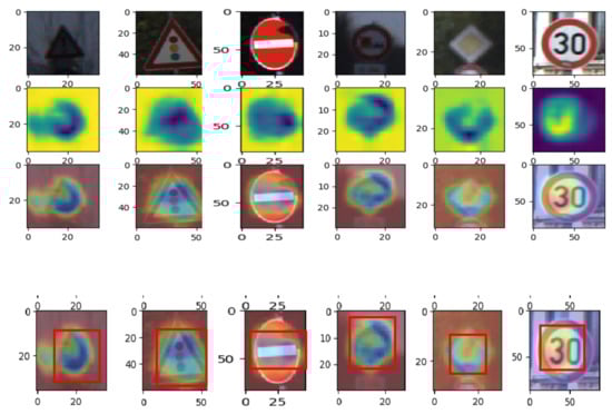 Feature maps: Attention maps represent the discriminative parts of the traffic sign. The image part is localized from the attention maps and enlarged to further improve cropping. The top row is the original traffic signs; the second row contains the activation maps; and the third row shows the part of the original images on which the model is focusing. The fourth row shows the discriminative part to be cropped with the bounding box.