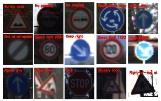 - Changzhen, X.; Cong, W.; Weixin, M.; Yanmei, S. A traffic sign detection algorithm based on deep convolutional neural network. In Proceedings of the 2016 IEEE International Conference on Signal and Image Processing (ICSIP), Beijing, China, 13–15 August 2016; pp. 676–679. [Google Scholar] [CrossRef]