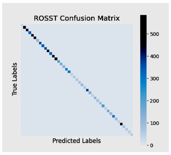 The result in Table 3 provides a comparison of the classification accuracy between ROSST, the proposed method, and some state-of-the-art supervised learning algorithms, which include single CNN with three STNs [29], DCGAN-PILAE [30], traffic sign classification based on pLSA [16], multiscale CNNs [31], BAGAN [32], traffic sign recognition with hinge loss CNNs (HLSGD) [49], and residual blocks CNN [50]. All these state-of-the-art methods were evaluated on the GTSRB dataset, making it fair to compare the proposed method ROSST with them. It is essential to note that, although the proposed method used a semi-supervised technique, it obtained an accuracy of 99.27%, which surpassed the BAGAN, pLSA, and multiscale CNN algorithms by over 2%, 1.03%, and 0.33%, respectively. The ROSST’s recognition rate however trailed the other supervised learning methods with a smaller margin. This occurred because those frameworks had accuracy rates that were higher than the proposed method.