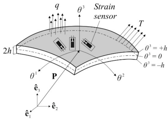 It is assumed that external forces involving the in-plane and out-of-plane components, and , are applied to the shell body. Besides, the rigid body motion of the body is fully constrained. Furthermore, as depicted in Figure 1, strain sensors are attached at discrete locations on the surface of shell, providing real-time strain measurements. The inverse problem at hand is the dynamic tracking of the three-dimensional displacements of the shell body utilizing only the in situ discrete surface strains and boundary restraints. In the following sections, the precise solution of this inverse problem is derived based on an isogeometric iFEM methodology.