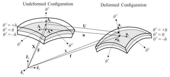 where represents a position vector to a material point on the mid-surface in reference configuration and denotes a unit-magnitude vector field (the director vector) that is perpendicular to the tangent plane of any point belongs to mid-surface in reference configuration (Figure 2). As given in Equation (2), both and are only functions of the in-plane coordinates . Taking partial derivative of with respect to provides the covariant base vectors of the mid-surface in reference configuration as: