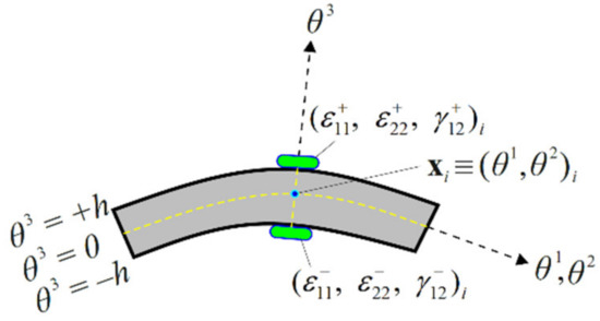 where and are the surface strains measured at discrete locations with the superscripts ‘+’ and ‘–’ denoting the quantities that correspond to the top and bottom surface locations, respectively.