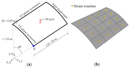 (a) Scordelis–Lo roof with symmetric boundary conditions; (b) its discretization (ne = 4), using iKLS elements with top- and bottom-surface strain rosettes per each element.