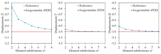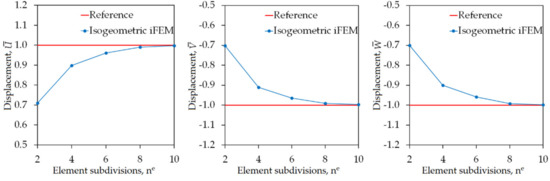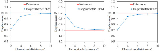 where maximum values of the reference displacements are , , and . The legend “iFEM” represents the isogeometric iFEM solutions, whereas the legend “Reference” represents the high-fidelity FEM solutions (henceforward, refer to all graphs). In Figure 6, maximum values of the iFEM and FEM predictions for the , , normalized displacements given in Equation (31) are plotted, versus the number of element subdivisions (ne) of the Scordelis–Lo roof, respectively.