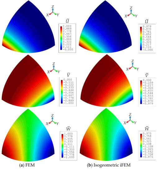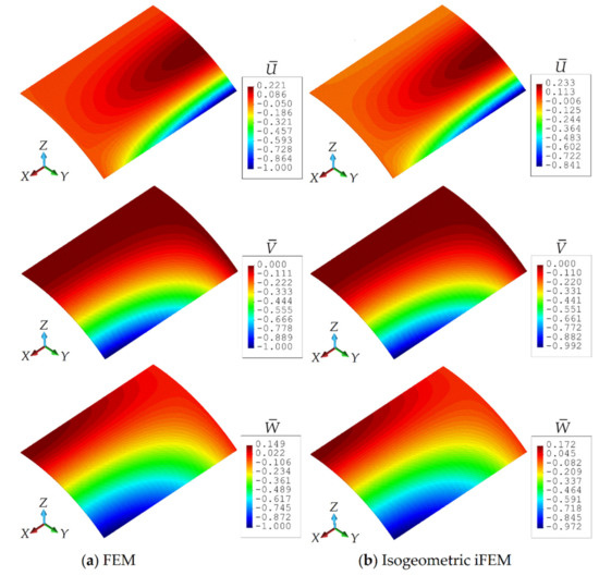 Contour plots of ,, displacements for hemisphere: Comparison between (a) high-fidelity FEM and (b) isogeometric iFEM (ne = 6) analyses.