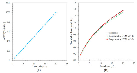 Apart from the linear and small deformations, the capability of the isogeometric iFEM formulation for reconstruction of nonlinear/large deformation is also assessed, by performing shape-sensing analyses on the geometry of Scordelis–Lo roof. For this purpose, the gravitational load of the geometry is incrementally increased from 50 to 1000 m/s2 for 20 load-steps, , shown in Figure 8a. Under this loading condition, the direct FEM analysis was performed on the same high-fidelity FEM mesh, by applying the symmetric constraints described previously. This direct structural analysis was conducted in ANSYS Mechanical APDL software, where the option of geometrically nonlinear analysis was turned on to obtain accurate solutions for the large displacements. In this manner, reference large displacement solution, as well as the nonlinear strain data representing the experimental strain measurements, are accurately established. Then, the strain-rosette measurements at the geometric center of each iKLS elements available in the isogeometric discretization are collected from the high-fidelity FEM analysis and transferred to the iFEM analysis for each incremental load-step of . With this nonlinear strain data variation over the load steps, the isogeometric iFEM analyses are performed for coarse and fine iKLS models, with the element subdivisions of ne = 4 and ne = 8, respectively.