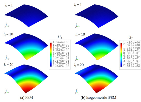 As a result of the either iFEM and FEM analyses, the maximum total displacement, , is observed at point A located in the roof geometry shown in Figure 5a. The variation of this displacement versus increasing load-steps are compared between isogeometric iFEM (ne = 4 and ne = 8) and reference solutions in Figure 8b. Here, the percent difference between reference analysis and iFEM/iKLS analysis of ne = 4 and ne = 8 for maximum total displacement at load-step of is approximately 1.04% and 4.40%, respectively. As can be clearly observed from Figure 8b that the total displacement, , possesses a nonlinear variation against incremental load and this nonlinearity is accurately captured by using the isogeometric iFEM methodology. In addition to maximum displacement comparisons, the total displacement contours obtained from the iFEM/iKLS (ne = 4) and high-fidelity FEM analyses are compared to each other for different loads-steps in Figure 9. For a prudent comparison between reconstructed and reference deformed shapes, these displacement contours are plotted over deformed configurations of the roof geometries. According to the displacement contours, the spatial variations of the total displacement obtained from iFEM are almost identical to those of reference solutions for different load steps. Moreover, in the case of increasing load, the nonlinear deformed shapes produced by iKLS model (ne = 4) conforms accurately to the reference deformed configurations, thereby demonstrating the highly predictive capability of the isogeometric iFEM formulation for nonlinear shape sensing, even with a low number of sensors. Although the present formulation does not accommodate the nonlinear strain components in the analytical strain definitions, the linear analytical strains can still be used to approximate the effect of nonlinear and large deformations, as long as the in situ experimental strains contain the nonlinear strain contributions. This is because the weighted least-squares functional of iFEM aims to match the analytical definition to those of experimental input strains. If the experimental strains include nonlinear effects (i.e., large enough as in the case of large deformations), then a linear analytical strain definition can even be capable of nonlinear deformation reconstruction. Hence, it can be concluded that, in addition to the linear displacement, the present isogeometric iFEM formulation is a viable technology for predicting sufficiently accurate nonlinear displacements with a coarse isogeometric discretization.