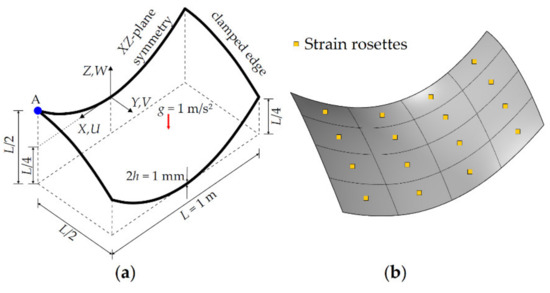 (a) Hyperbolic paraboloid with symmetric boundary conditions; (b) its discretization (ne = 4) using iKLS elements with top- and bottom-surface strain rosettes per each element.