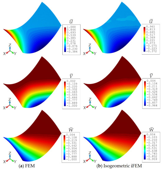 Contour plots of ,, displacements for hyperbolic paraboloid: Comparison between (a) high-fidelity FEM and (b) isogeometric iFEM (ne = 6) analyses.