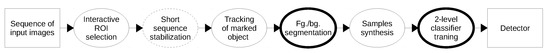 The first stage of processing is and interactive collection of training samples (Interactive ROI selection). The user marks an object in the image and initializes the tracking procedure to collect more training data for the selected object (Tracking of marked object). In case of un-stabilized images (e.g., from hand-held camera) additional stabilization step can be applied (Short sequence stabilization). The tracking is open to user intervention e.g., correction of the ROI in a single frame or frames.