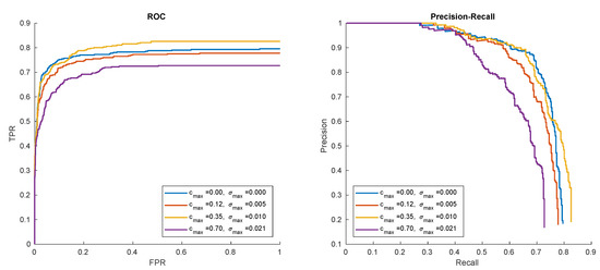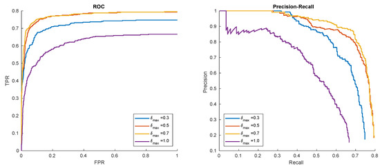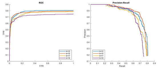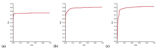 Results of the experiments (ROC curve) for the selected pattern P1 are presented in Figure 18a. EER is similar for all patterns P1–P3, and is equal to 25.3%, 28.3%, and 28.0% for each pattern, respectively. Accumulated EER equals to 27.4%. Obtained results resemble those from smaller dataset. Even though the training sample and query images were obtained from different devices and had a different quality, the algorithm gave satisfactory results.