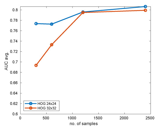 The Gaussian kernel size and SVM regularization parameter C are adjusted using automatic cross-validation procedure performed on the training data. For SVM classification Histogram of Oriented Gradients features [40] are extracted. There were used 2 resolutions of training images: 24 × 24 and 32 × 32. For each sample a 9-element histogram in 4 × 4 cells is created with 16 × 16 histogram normalization window overlapping by 8 pixels, thus giving HOG features in total in 24 × 24 case and in 32 × 32 case.