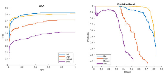 Receiver Operator Characteristic (ROC) and Precision-Recall (PR) curves of hat, logo, helmet, and shirt detections in ’00012’ sequence.