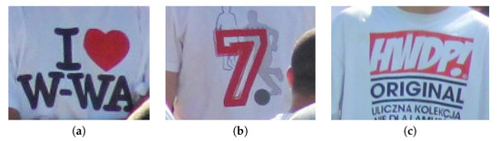Tests of the presented algorithm were conducted on a dataset containing 11 recordings, with nearly 30 thousand frames in total, with full HD resolution. Three patterns were created (Figure 17), and all sequences were carefully labeled by hand to create ground-truth data. All patterns were created based on a single frame (one positive sample). As training data, a high quality still picture was used, with resolution scaled down to full HD.