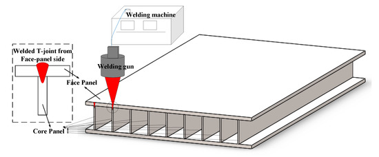 Web-core sandwich panels are kinds of lightweight structures with many advantages, such as the high strength and high stiffness to the weight ratio. The characteristics of the structure make it potential in many fields, such as aviation, aerospace, the marine shipbuilding industry, etc. [1,2,3,4]. The structure consists of two face panels separated by core panels that are aligned orthogonally to the faces (Figure 1). Welding is considered as an effective process to join the cover and core panel with T-joints. However, it is sometimes impractical to weld T-joints using conventional fillet welds due to the shielding of the face panels. Instead, the welding must be achieved from the face panel side to connect the face panel to the core panels (Figure 1) [5,6]. Many researchers have concerned the welded T-joints from the face panel side. The influence of weld width on the mechanical properties of laser-welded joints of hull steel CCS-B sandwich plates were analyzed based on the experimental investigation and finite element method [7]. Romanoff et al. [8] proposed a novel evaluation approach of the web-core sandwich structural response under patch load. Authors in [4,9] proposed a new method for the thermal elasto-plastic analysis for T-joint laser welding to reduce the computation time by employing shell element model replacing the solid element model. Yong [10] studied the effect of the laser process (such as laser power, spot diameter, etc.) on the weld formation quality in the in the welding of a sandwich structure made of dissimilar-metals of AZ31B magnesium alloy and 304 stainless steel at Taiyuan University of Technology. The mathematical model of the formation process of the porosity in the weld pool of the T-joint on steel sandwich structures was established in [11]. As far as the T-joints penetration welding in sandwich structures is concerned, it is important to detect the weld position to ensure the quality of joint. For example, when the deviation of welding torch and the weld position becomes out of range, the connection strength of the welded joint could not be guaranteed. Weld position detection could remain the good quality of weld. Accordingly, it is necessary to develop an effective method for detecting the weld position in web-core sandwich panels.