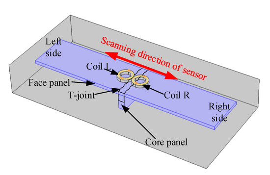 As shown in Figure 2, the proposed eddy current sensor consists of two separated coils with the same parameters and the same alternating excitation signal, the two coils are winded in the opposite direction, one coil is winded clockwise while the other one is winded anticlockwise from the top view. Two separated coils named as coil L and coil R are arranged side by side symmetrically about the T-joint to scan the specimen along the cross section of a T-joint weld. When the T-joint enters the sensitive region of eddy current sensor, the change of the induced current in specimen would result in alteration of magnetic flux passing through the two separated coils, which lead to the change of the equivalent impedance and the output voltage signals Vl and Vr of two separated coils. The difference ΔV of Vl and Vr is taken as the output signal of the eddy current sensor. The feature point, which represents the center position of the T-joint (i.e., the center position of the core panel), could be determined from the amplitude curve of sensor output signal.