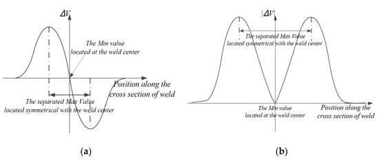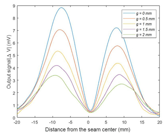 Figure 3b shows the amplitude of sensor output signal when completing a single scanning of the weld. Considering that the parameters of coil L and coil R were consistent and the arrangement of two separated coils and the T-joint were symmetrical about the seam center, the signal amplitude was symmetrical about the center of weld.