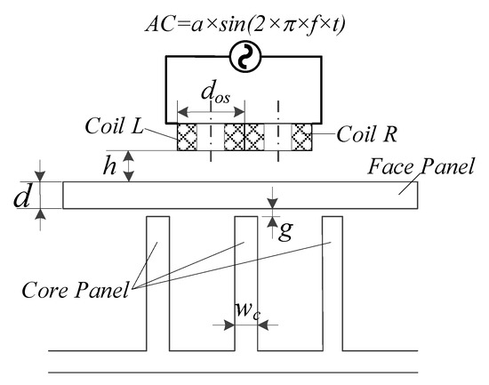 As shown in Figure 4, the primary factors affecting the output signal of the proposed eddy current sensor and the capability of detection system are considered. These include the excitation frequency f, the coil parameters (especially the outer diameter of coil dos), lift-off distance h (distance between the bottom surface of the coil and the specimen), and the dimension of weld (the thickness of core panel wc, the gap distance g, thickness of cover panel d). As shown in Equation (1):