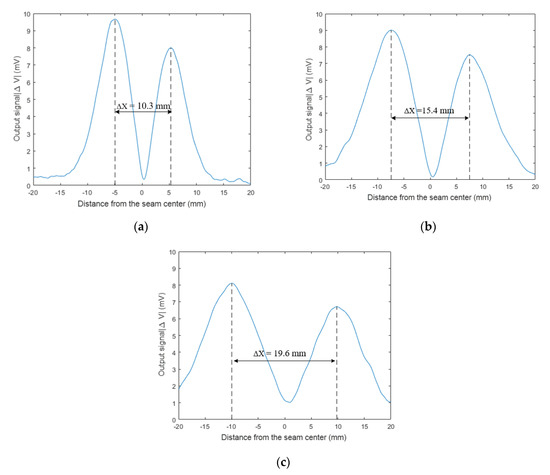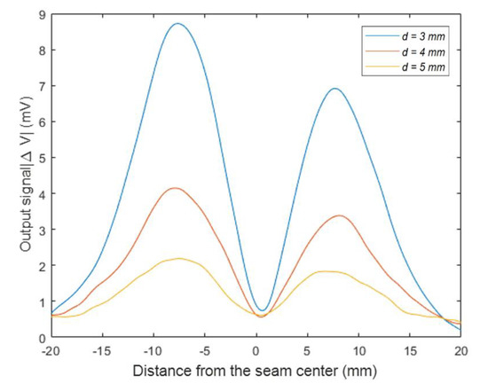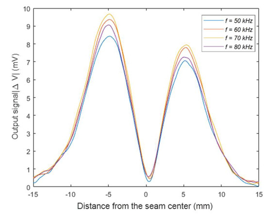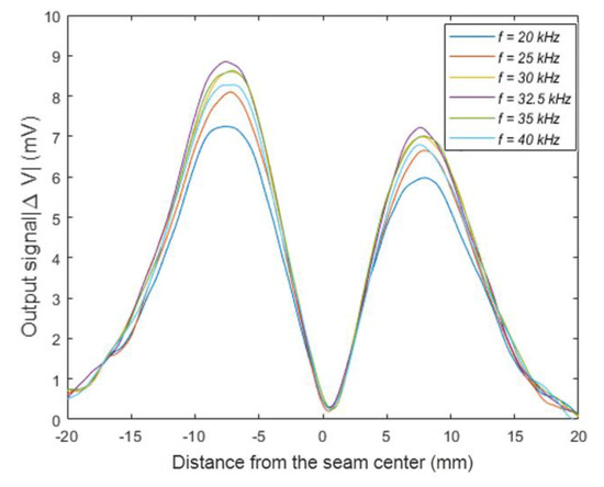 As shown in Figure 5, when the exciting frequency increased from 20 to 32.5 kHz, the output signal became more sensitive to the distance from the seam center. When the frequency was increased to 32.5 kHz, the change in output became the most significant. On the contrary, for the frequency higher than 32.5 kHz, the output signal decreased. Therefore, a frequency of 32.5 kHz was decided to be the optimal exciting frequency of a given specimen.
