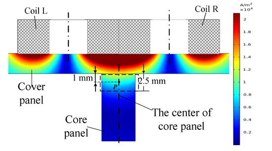 The sensitivity of the proposed detection method of the T-joint was determined by the cumulative intensity of eddy current density of sensitive volume in the core panel. With the increase of the excitation frequency, the eddy current density in the core panel would first increase and then decrease. Thus, the optimal excitation frequency could be acquired to penetrate the cover panel and induce sufficient eddy current density of sensitive volume in the core panel. According to Equations (2) and (3), an approximate optimal frequency could be estimated, and then the optimal frequency can be obtained by testing under multiple frequencies around the estimated approximate frequency.