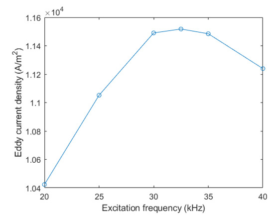 There is an inverse relationship between the penetration depth of the eddy current sensor and the square root of excitation frequency [24]. As shown in Equation (2), for a specimen made of given material, the higher excitation frequency leads to the smaller penetration depth of sensor. On the other hand, the induced current density is proportional to the frequency within the range of penetration depth of sensor (see the Figure 6). The sensitivity of the proposed detection method of the T-joint is determined by the cumulative intensity of the eddy current density in the core panel in the depth and radial directions. Therefore, the appropriate excitation frequency should be determined by the tradeoff between the sufficient penetration depth in the cover panel and the enough induced current density of in the core panel along the depth (the upper area of the core panel). When the cumulative intensity of eddy current density in the upper area of the core panel (sensitive volume of sensor) reaches the maximum and the sensitivity of proposed detection method at this time would be best.