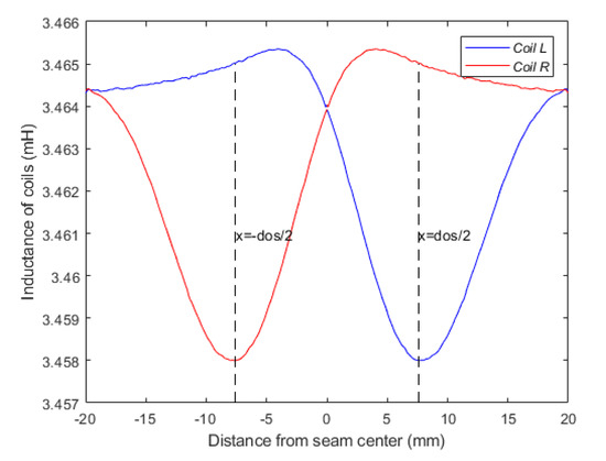As shown in Figure 8, the center of the core panel was aligned with the center of the coil L of the sensor while the offset distance between the center of sensor and core panel was 0.5 × dos. The sensitive volume of the specimen within the detection range of the coil L reached the maximum. Thus, the effect of the specimen on the equivalent impedance of the coil L also reached the maximum, which led to the maximum difference between equivalent impedances and voltage of coil L and coil R. Figure 9 shows the inductance curves of the separated coils of sensor during single scanning of the weld seam.