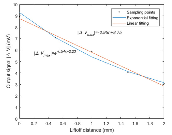 As the lift off distance increased from 0 to 2 mm, the maximum values of the output signal decreased from 8.9 to 3.1 mV. As shown in Figure 11, the exponential function and linear function were respectively utilized to fit the relationship between the lift off distance and the maximum value of sensor output signal. The mean squared error of the exponential fit was 0.08 while the mean squared error of the linear fit was 0.04. The linear fit was more accurate than the exponential fit.