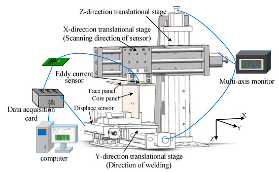 The eddy current sensor was mounted on the X-direction translational stage to scan the specimen along the cross section of weld. The specimen consisted of a face panel and a core panel, forming a T-joint as shown in Figure 15. The T-joint specimen was placed on the Y-direction translational stage to move along the welding line. The X-direction translational stage was fixed at the Z-direction translational stage to adjust the lift-off distance of the eddy current sensor and the specimen. The X–Y–Z direction translational stages formed the three-axis moving platform. The parameters of the translational stages are listed as Table 5. The output signal of eddy current sensor from the detection circuit and the signal of displacement sensor along the welding direction were fed into the data acquisition card (DAC) implemented in the computer, the parameters of the DAC are listed as Table 6. The computer was responsible for data processing and storage to obtain the characteristic value of the acquired signal, which represents the weld line.