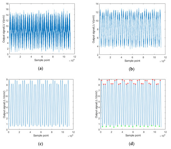 The procedure of signal processing: (a) original signal; (b) wavelet analysis; (c) smooth filter; and (d) acquisition of feature points.