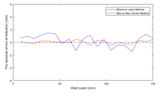 As shown in Figure 16, the acquired signals were processed by the proposed processing method. The feature points of weld were determined by the minimum value method and the separated maximum values method, respectively. Comparing the obtained feature points with the real seam center, the detection errors were obtained.