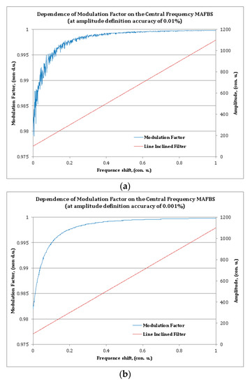Modulation factor as the function of MAFBS central frequency shifting: The blue line is the dependence of the modulation factor; the red line is the spectral characteristic of the optic linear oblique filter, for an amplitude definition accuracy of (a) 0.01% and (b) 0.001%.