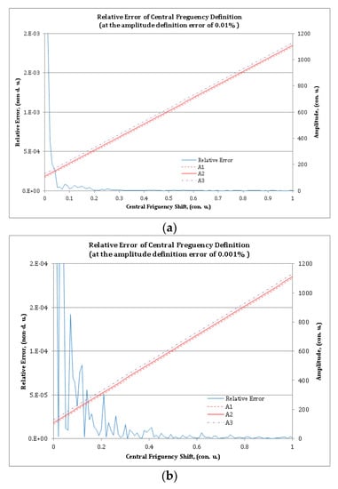 In Figure 4, violet, red, and brown lines show the calculated amplitudes of the carrier frequencies of the MAFBS obtained by numerically solving Equation (10) with the initial values in Equation (11). The blue line shows the relative error of central frequency shift determination of the MAFBS. Two calculation sets for EF = 0.01% (Figure 4a) and EF = 0.001% (Figure 4b) were made. The relative error of the central frequency shift determination of MAFBS, calculated via Equation (13), does not exceed 10−3 (for EF = 0.01%) and 10−4 (for EF = 0.001%), almost in the whole measurement range. The only exception is a small sector, where the amplitudes (A1, A2, and A3) are close to zero.