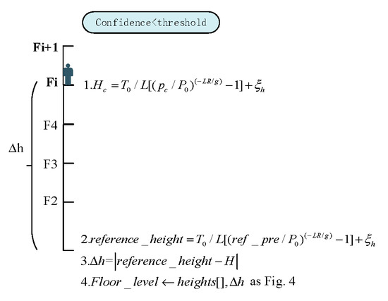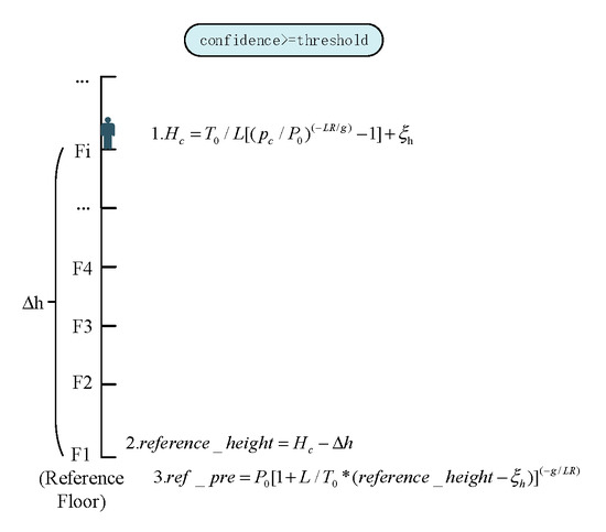 - “Reference pressure” calibration: when the confidence of BWFP exceeds the preset threshold, update the “reference pressure” algorithm as Figure 2 shows. Parameter represents the current barometer measurements, and represents the floor estimation result obtained by BWFP. We use an array of heights [] to record each height between adjacent floors within a multi-story building. Variable is the height difference between the current floor and the reference floor (the first floor as the reference floor in this paper), which can be estimated based on the parameter and heights []. The ref_pre is the calibrated pressure of the reference floor and reference_height is the estimated height of the reference floor.